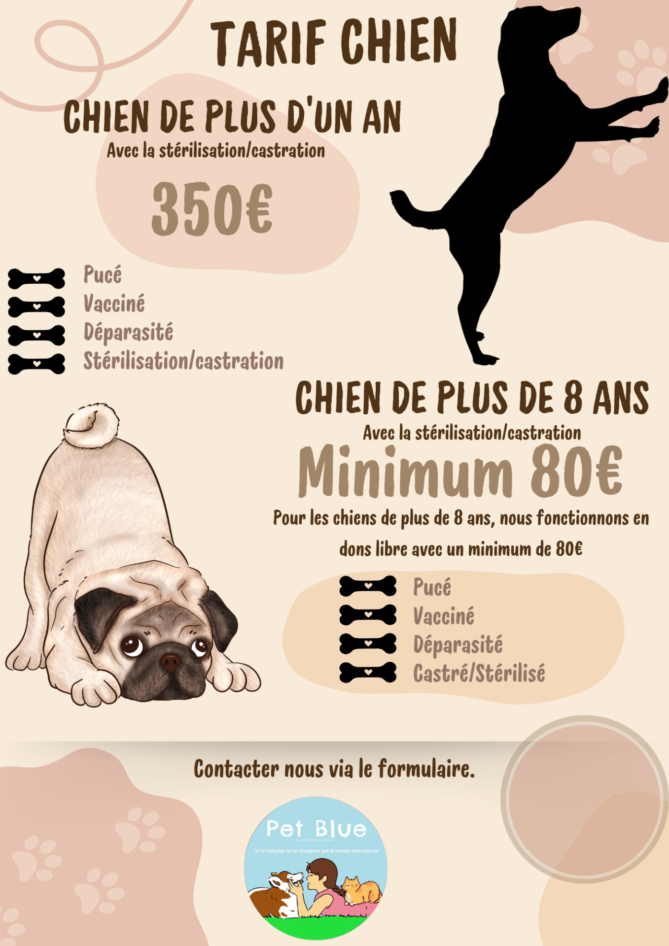 Alors voici nos tarifs, gardé en tête que la plupart des actes vétérinaire sont déjà effectués et qui sont compris dans le prix pour nous rembourser.